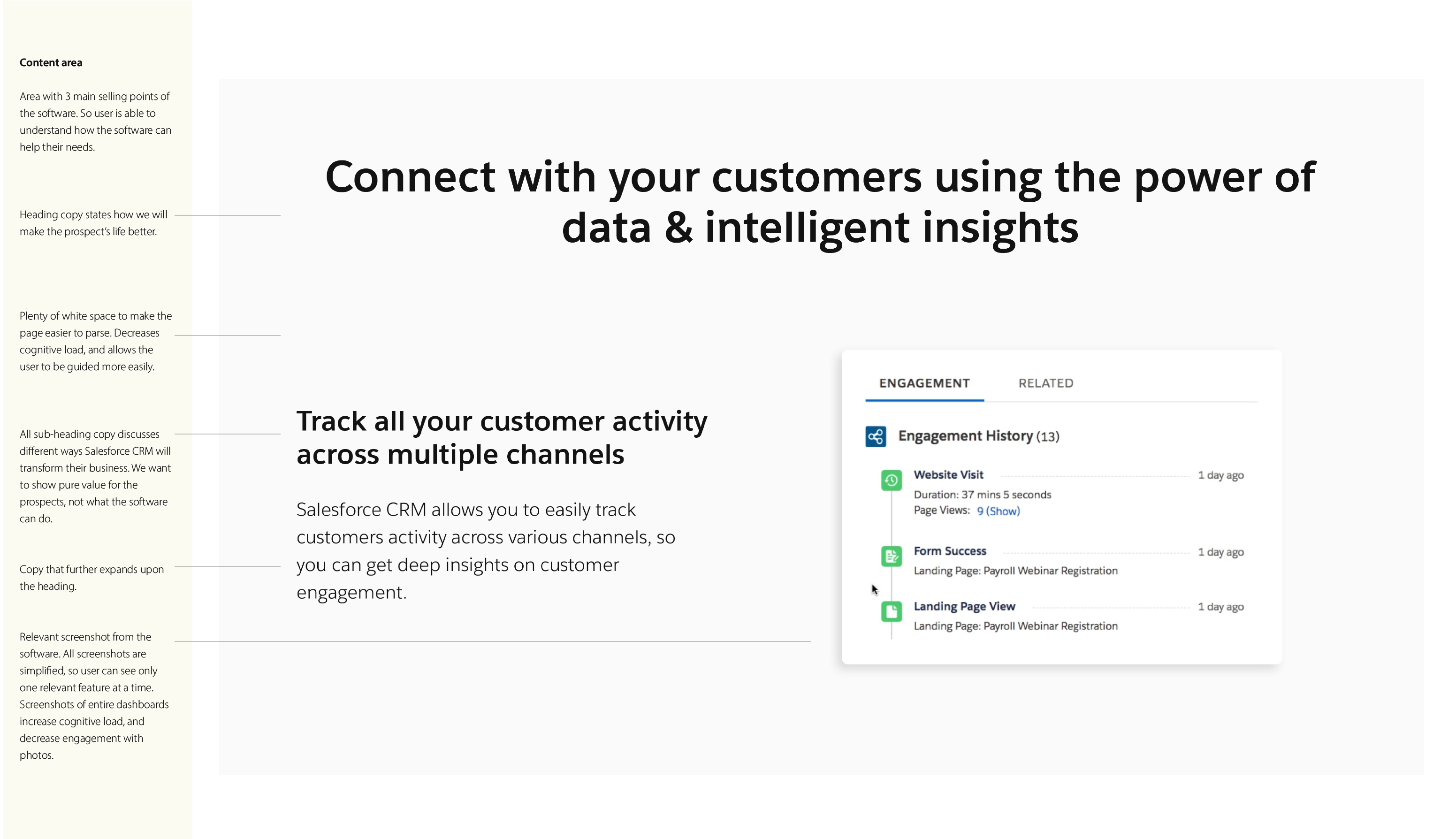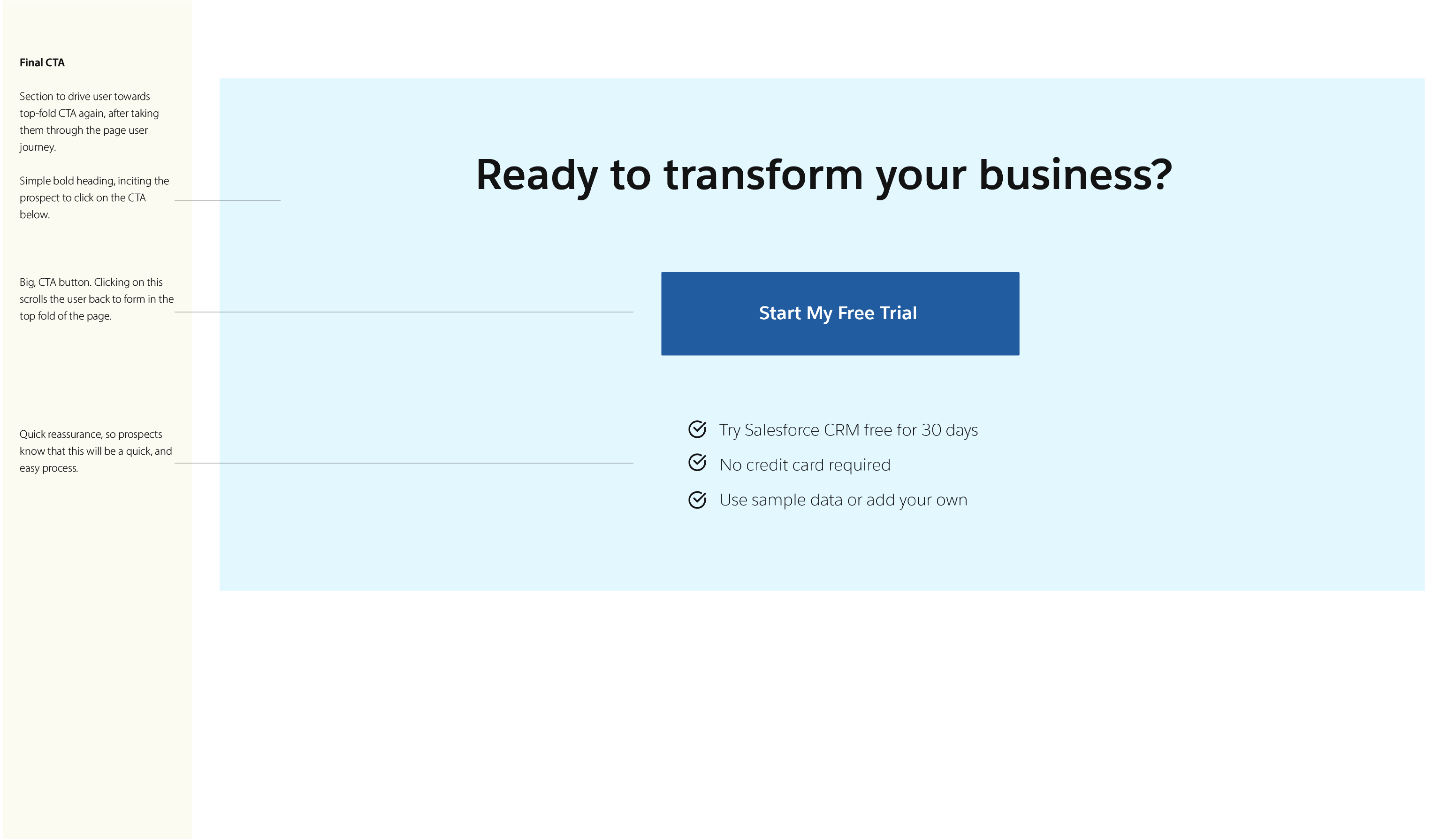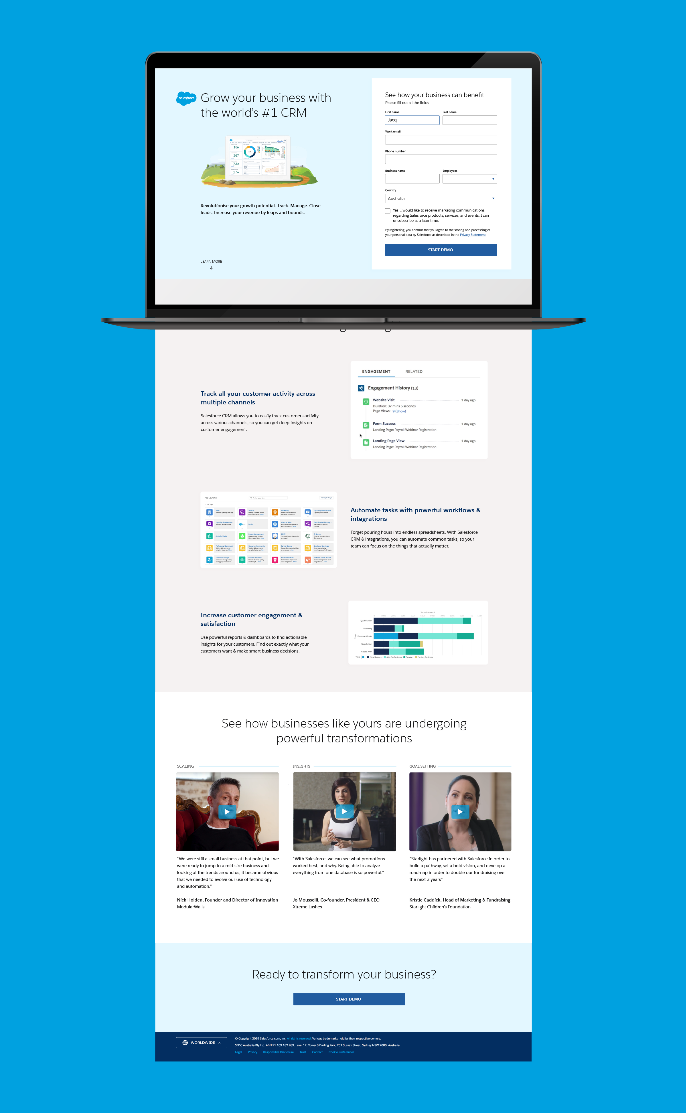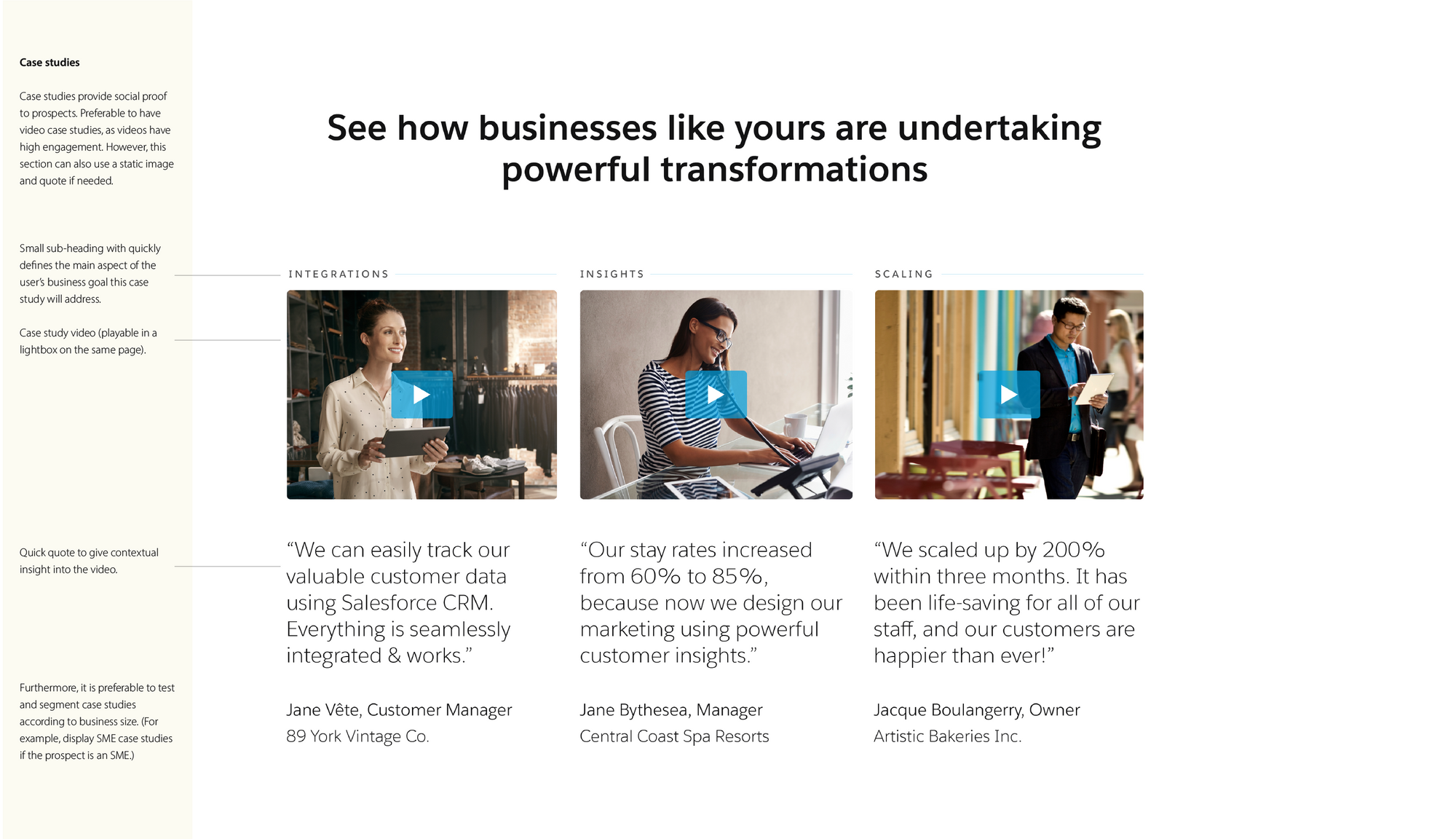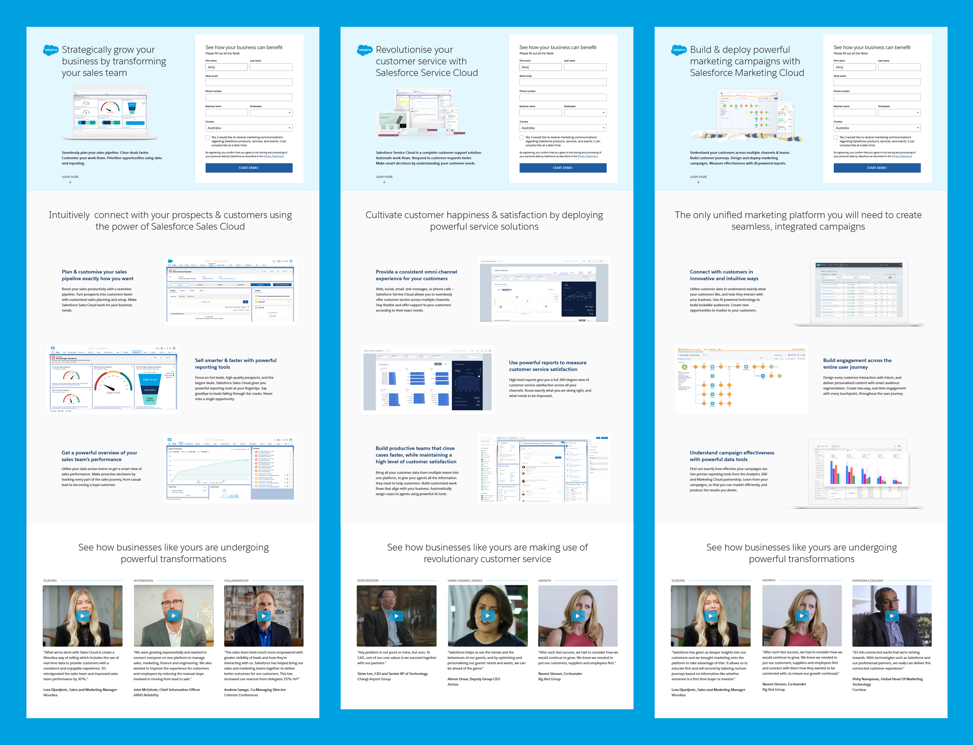 I also wrote all the copy for the final version. I added 3 Salesforce video case studies that were about a small business + the service in question. This included a customer quote from the video the really help build trust.