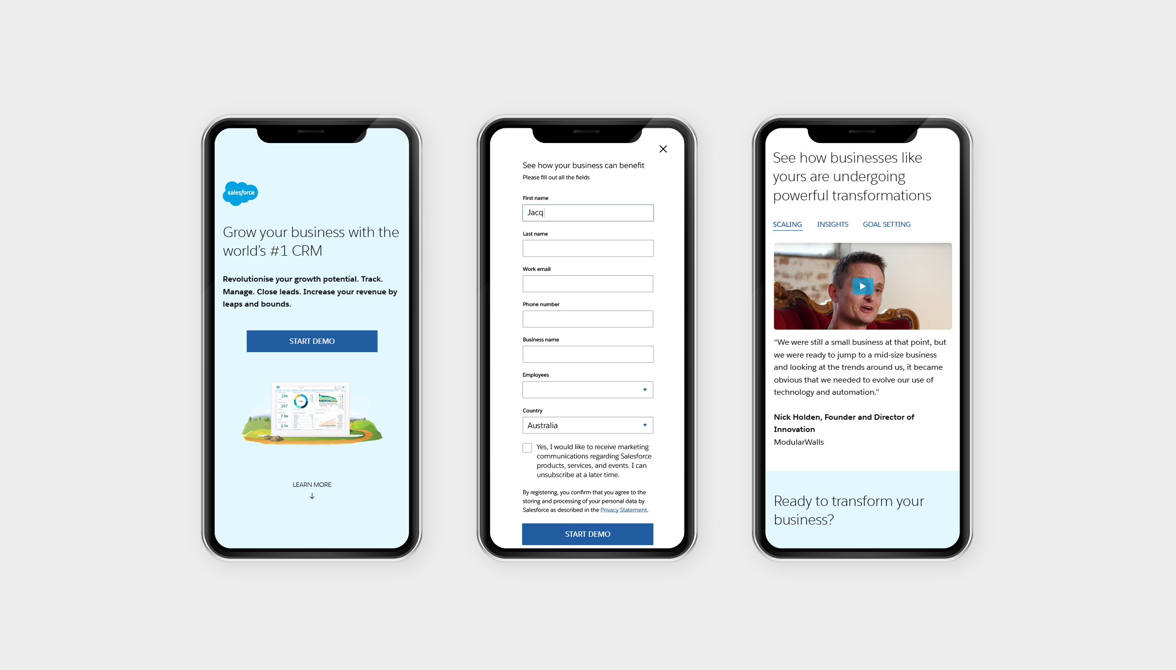 Conversion tests and user interviews showed that hiding content such as demo videos behind the sign-up form caused users to drop off. Users would close the Salesforce window and open up YouTube to find the same demo videos.